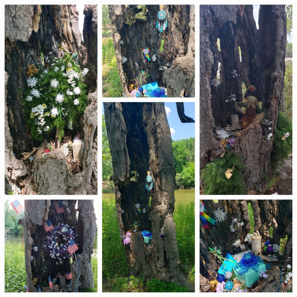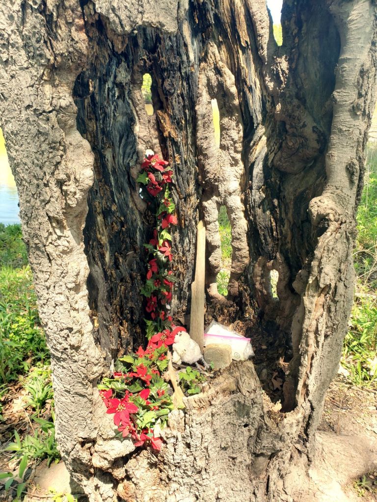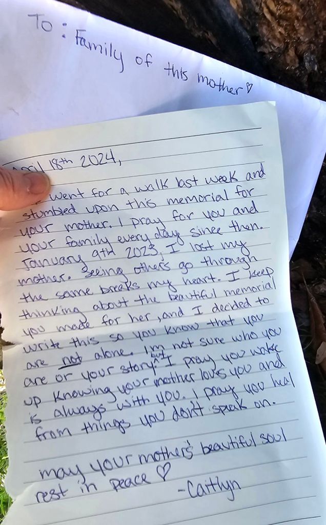 When things settled after Mom’s death in April 2023, I set out to find her tree, and with a little help from the guiding spirit, I came upon it, not too far from a walking trail, but looking a bit disheveled after five months of neglect.