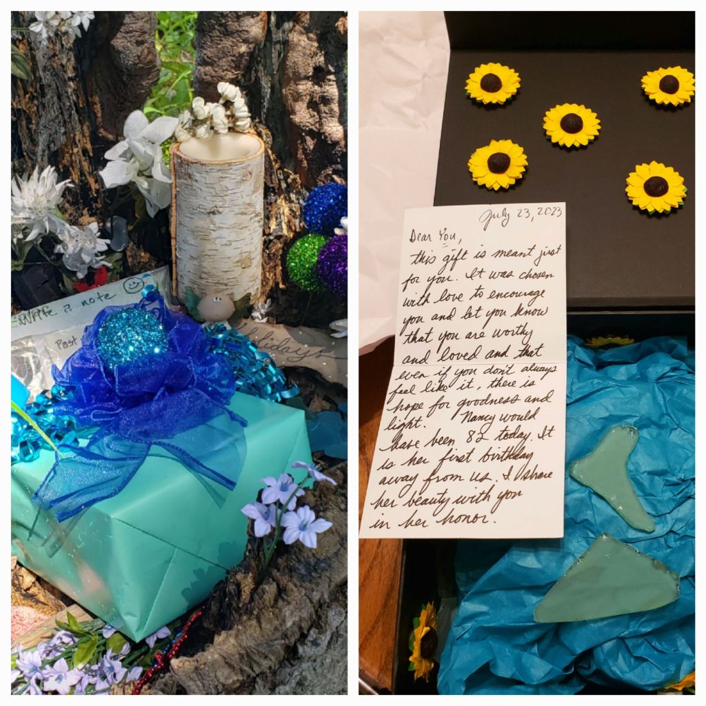 On Mom’s birthday, I brought a gift and left it for whoever felt the need to take it. That would have been how Mom would have loved a gift to be shared. I kept going back to check on it, and four months later, nobody had taken it. The box itself was full of goodies and even included $60 cash. No one ever took it, so I brought a friend to the tree whom I knew to be in a hard place in their life and offered the gift to them.
